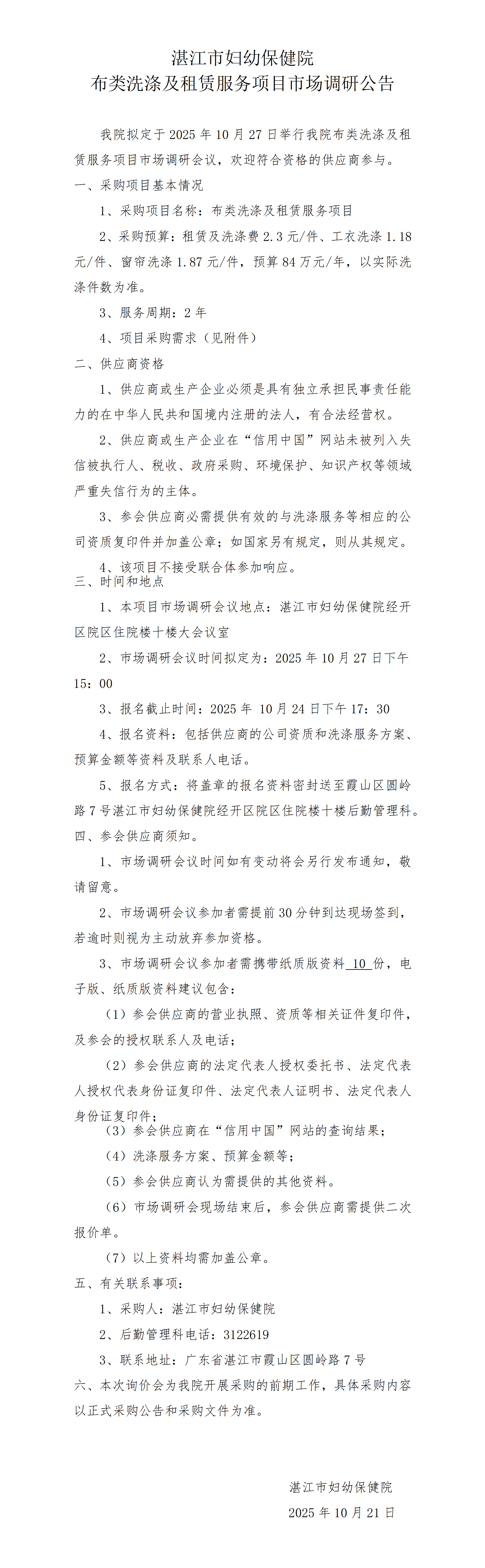湛江市妇幼保健院布类洗涤及租赁服务项目市场调研公告