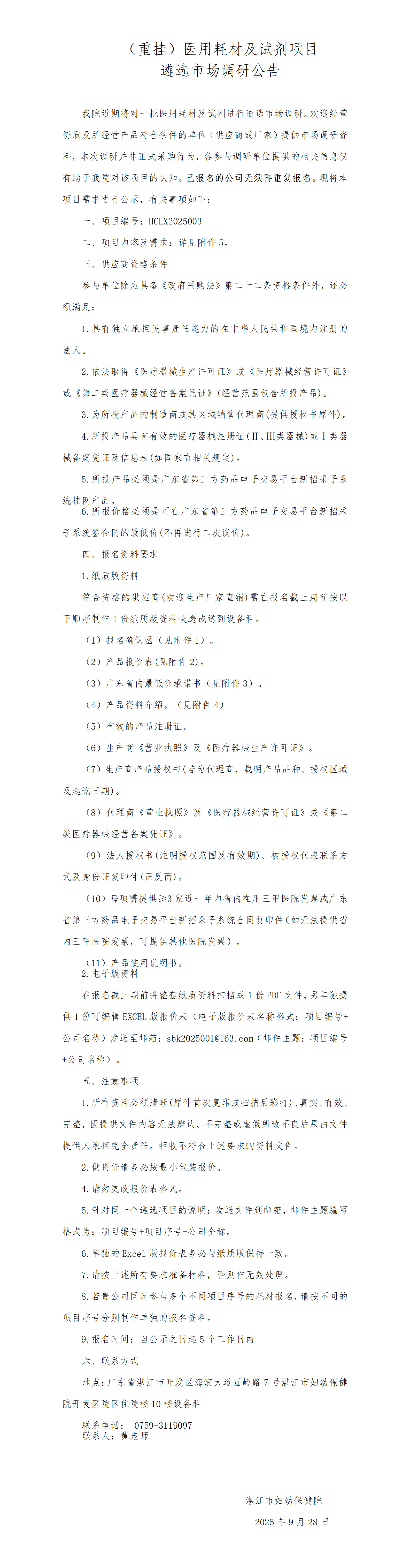 (重挂)医用耗材及试剂项目遴选市场调研公告