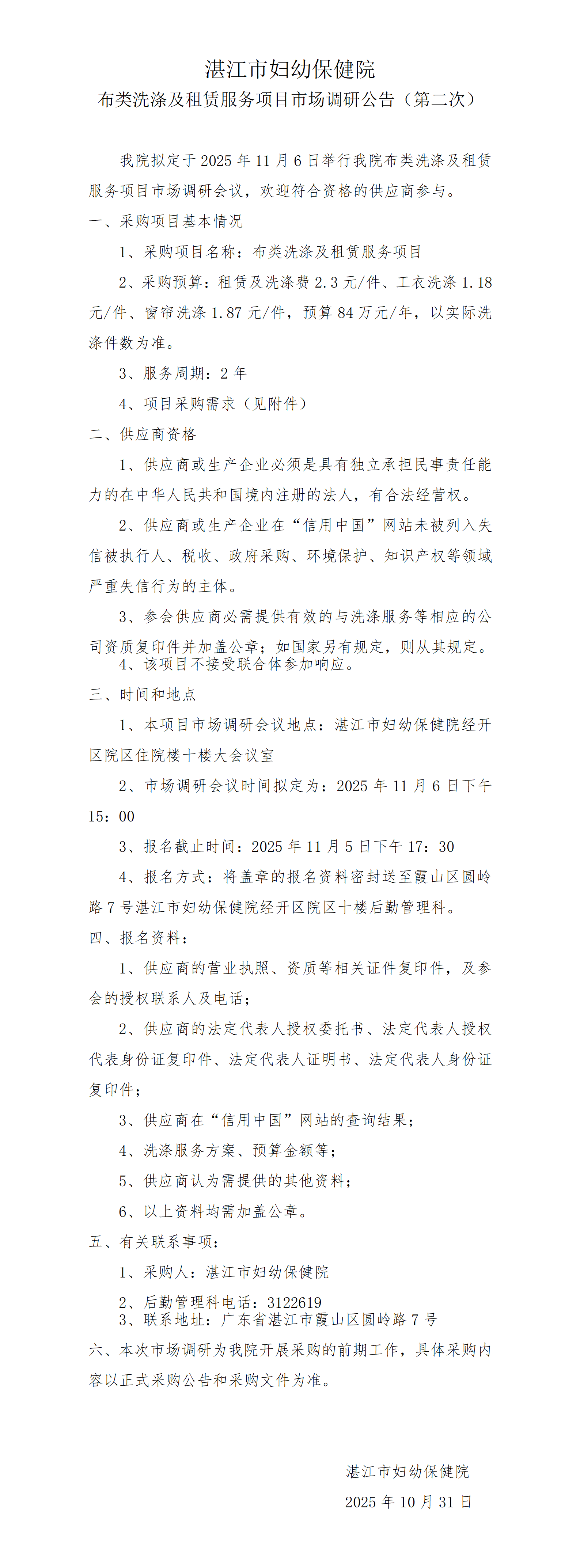 湛江市妇幼保健院布类洗涤及租赁服务项目市场调研公告(第二次)