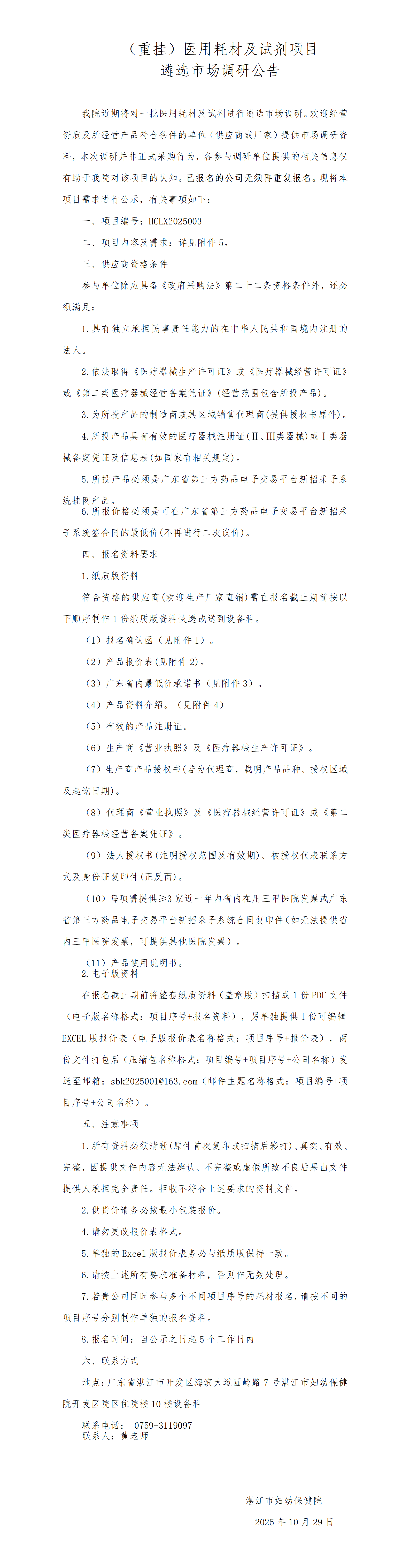 (重挂)医用耗材及试剂项目遴选市场调研公告