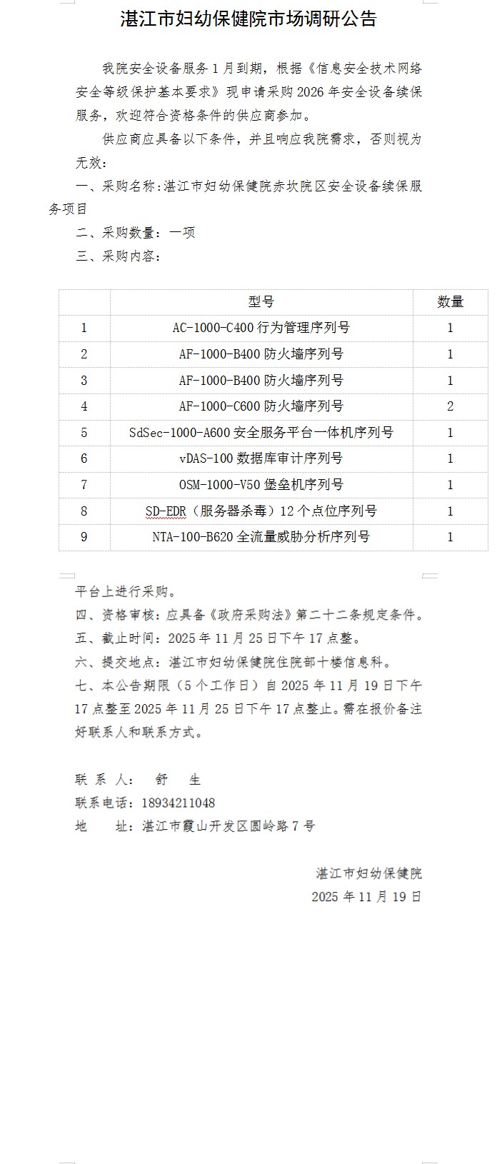 湛江市妇幼保健院市场调研公告