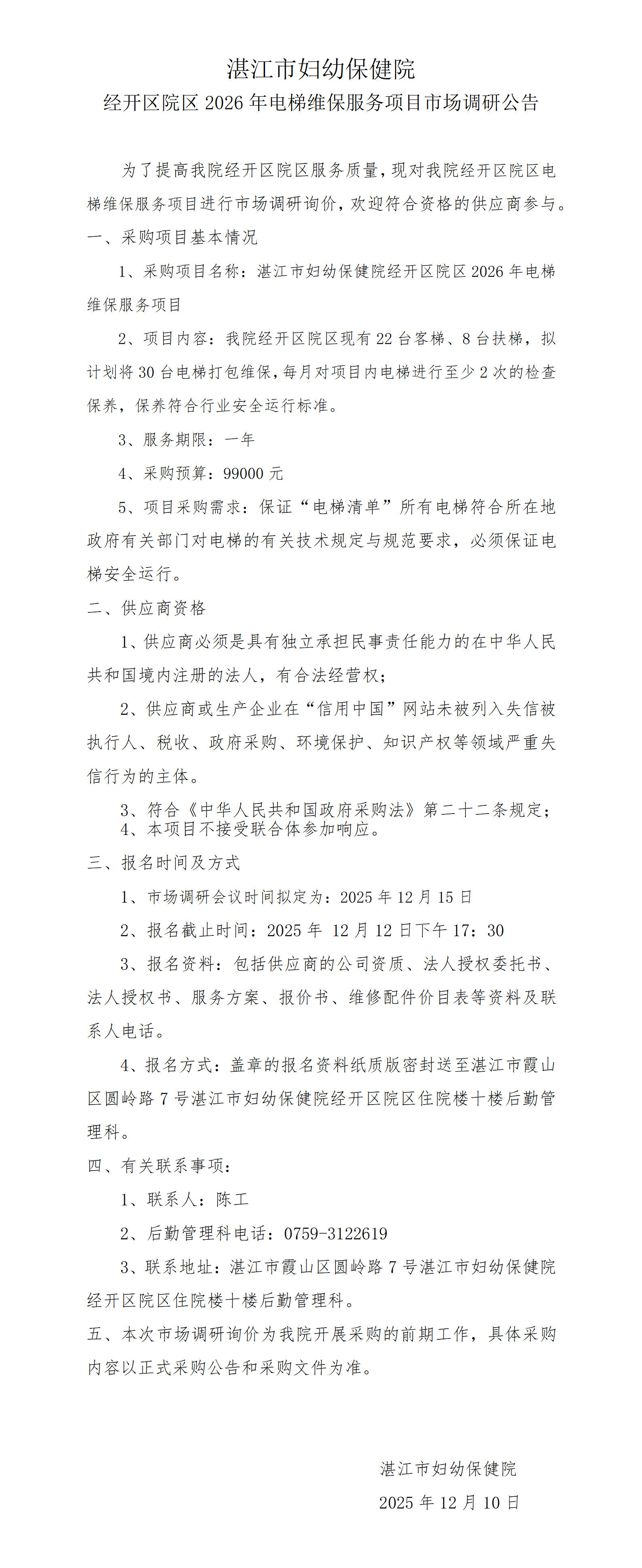 湛江市妇幼保健院经开区院区2026年电梯维保服务项目市场调研公告