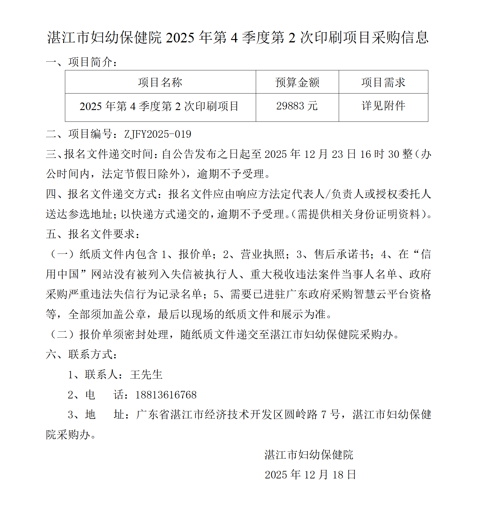 湛江市妇幼保健院2025年第4季度第2次印刷项目采购信息