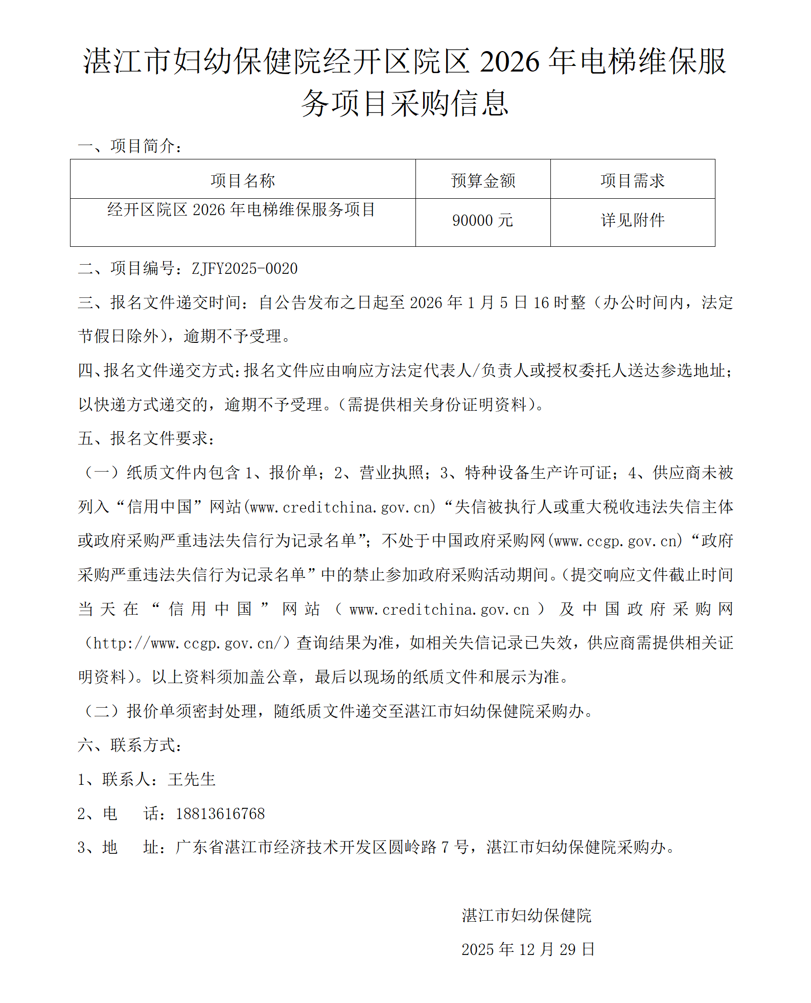 湛江市妇幼保健院经开区院区2026年电梯维保服务项目采购信息