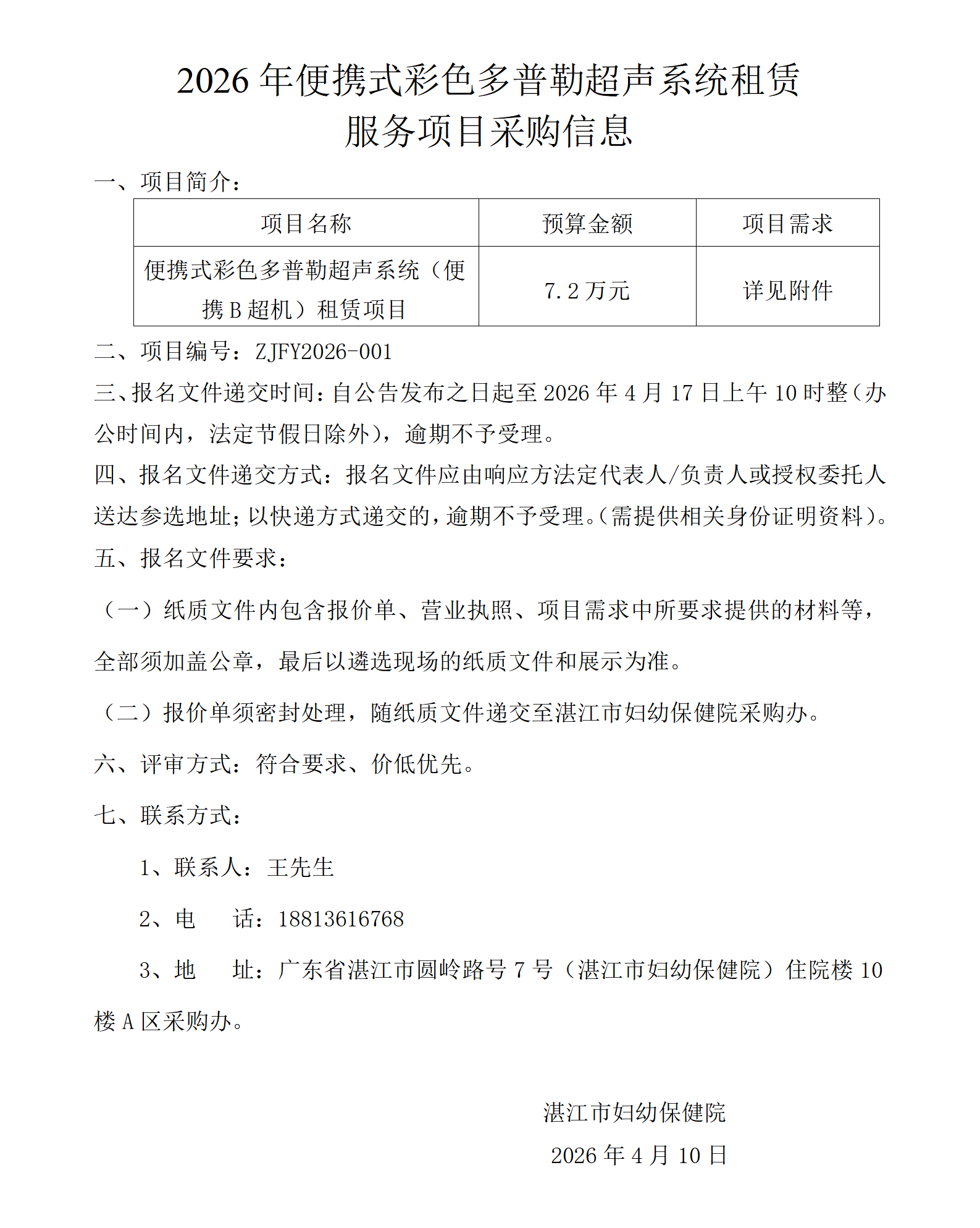 2026年便携式彩色多普勒超声系统租赁服务项目采购信息