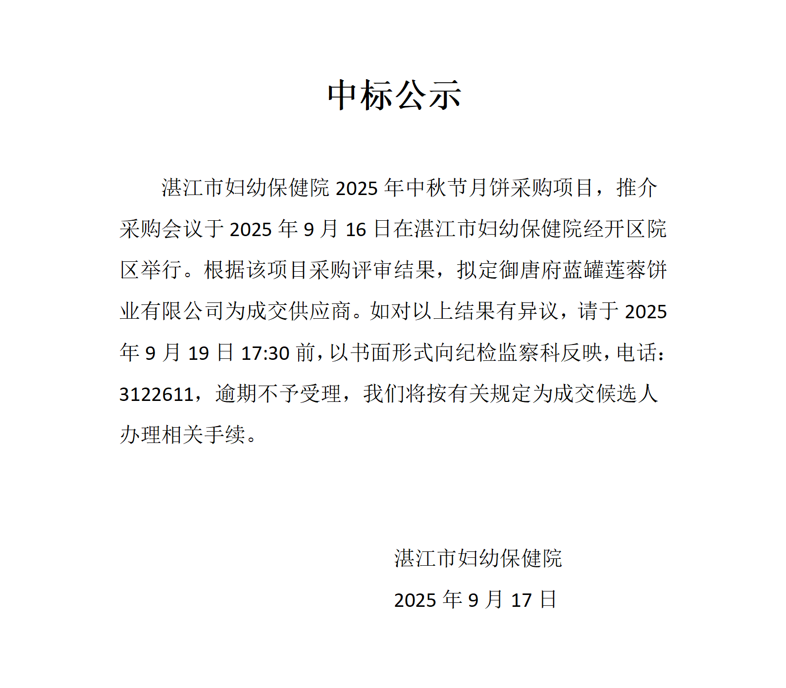 湛江市妇幼保健院2025年中秋节月饼采购项目中标公示