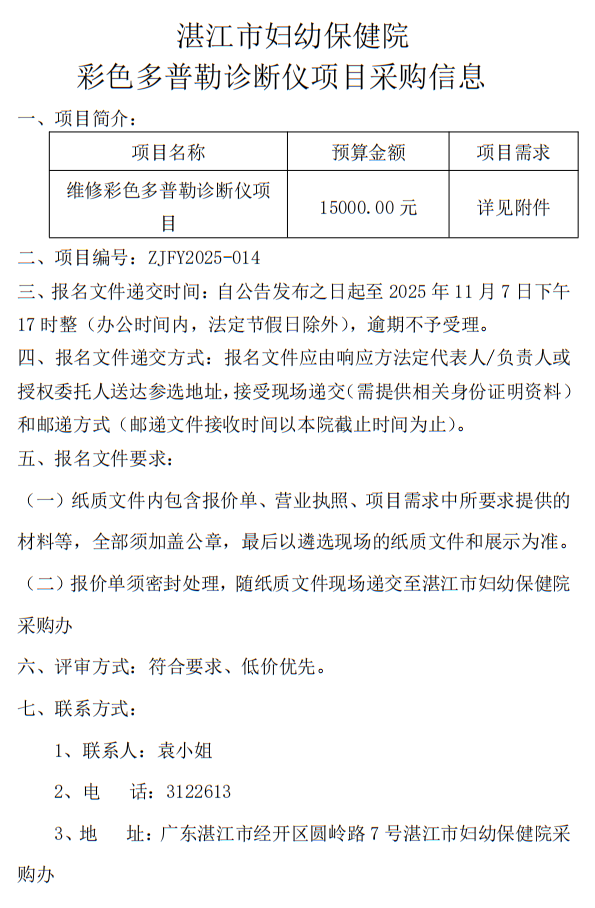 湛江市妇幼保健院 彩色多普勒诊断仪项目采购信息