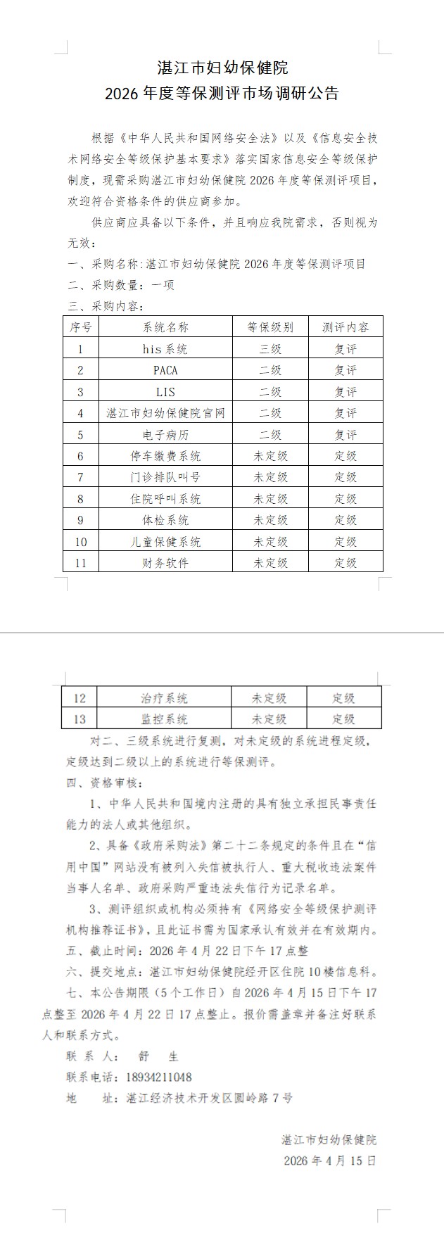 湛江市妇幼保健院2026年度等保测评市场调研公告